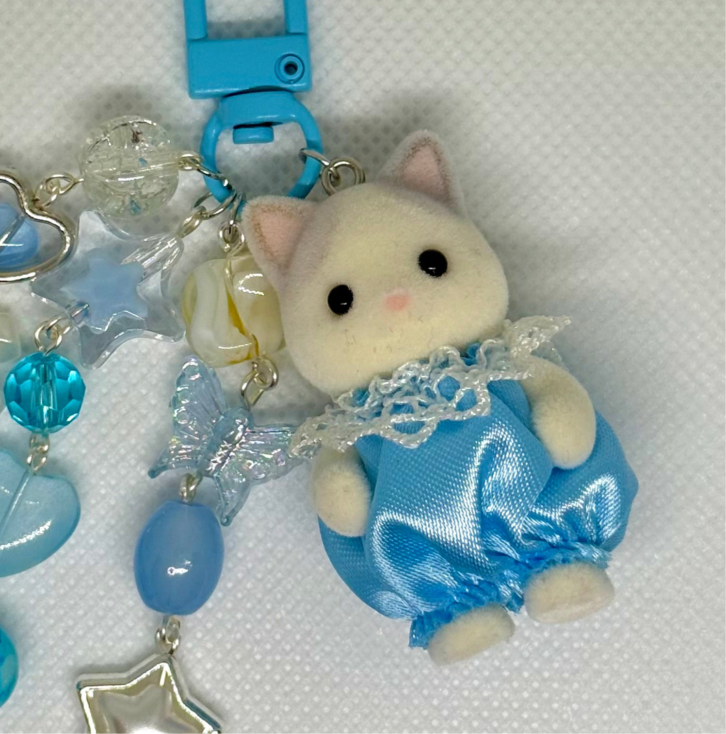 handmade chunky blue and white sylvanian kitty bag charm / keychain