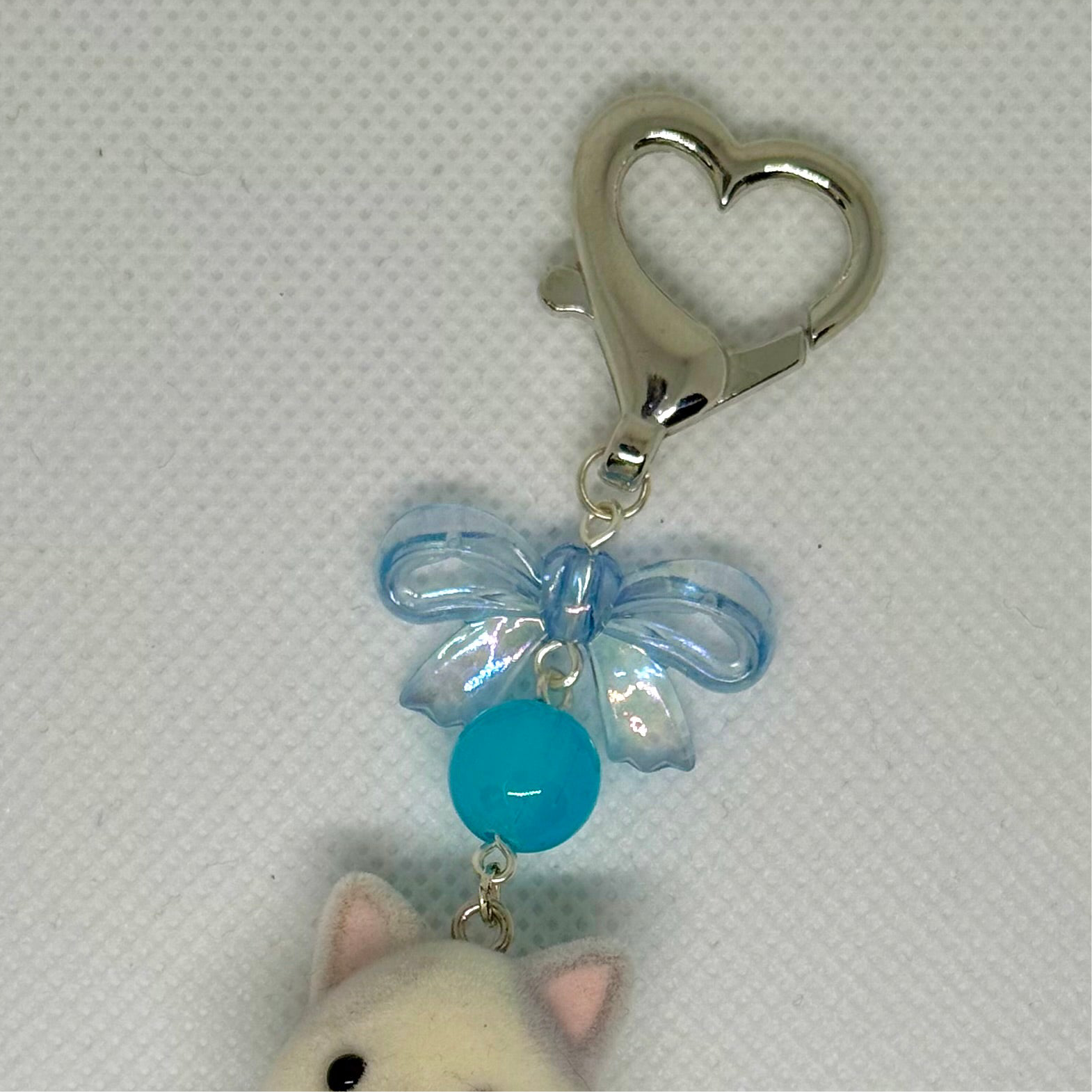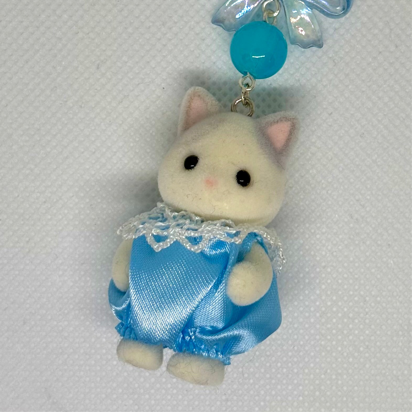 handmade baby sylvanian cat charm with a silver heart clasp keyring and a blue bow
