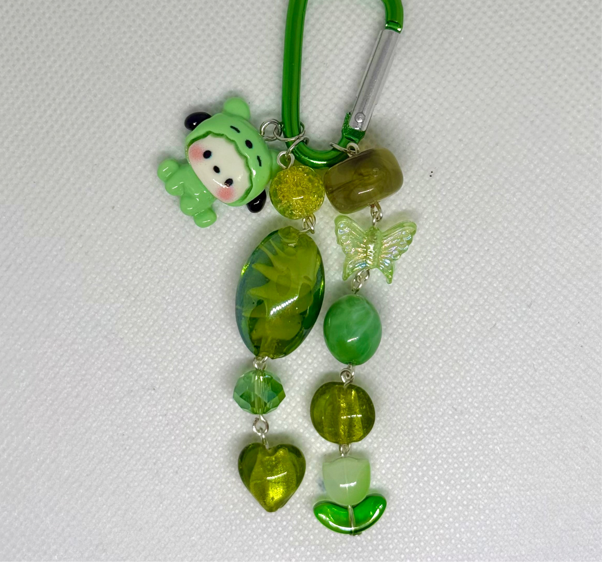 chunky pochacco charm / keychain featuring green glass beads and a green carabiner
